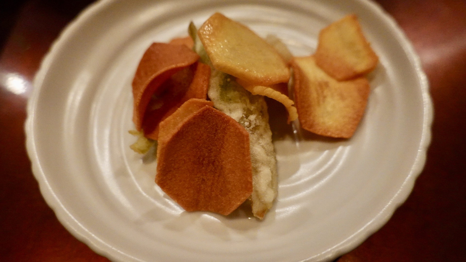 他にも、くわいチップスとタラの芽の天ぷら、赤ナマコの酢の物、聖護院かぶの擦り流しをかけた筍。