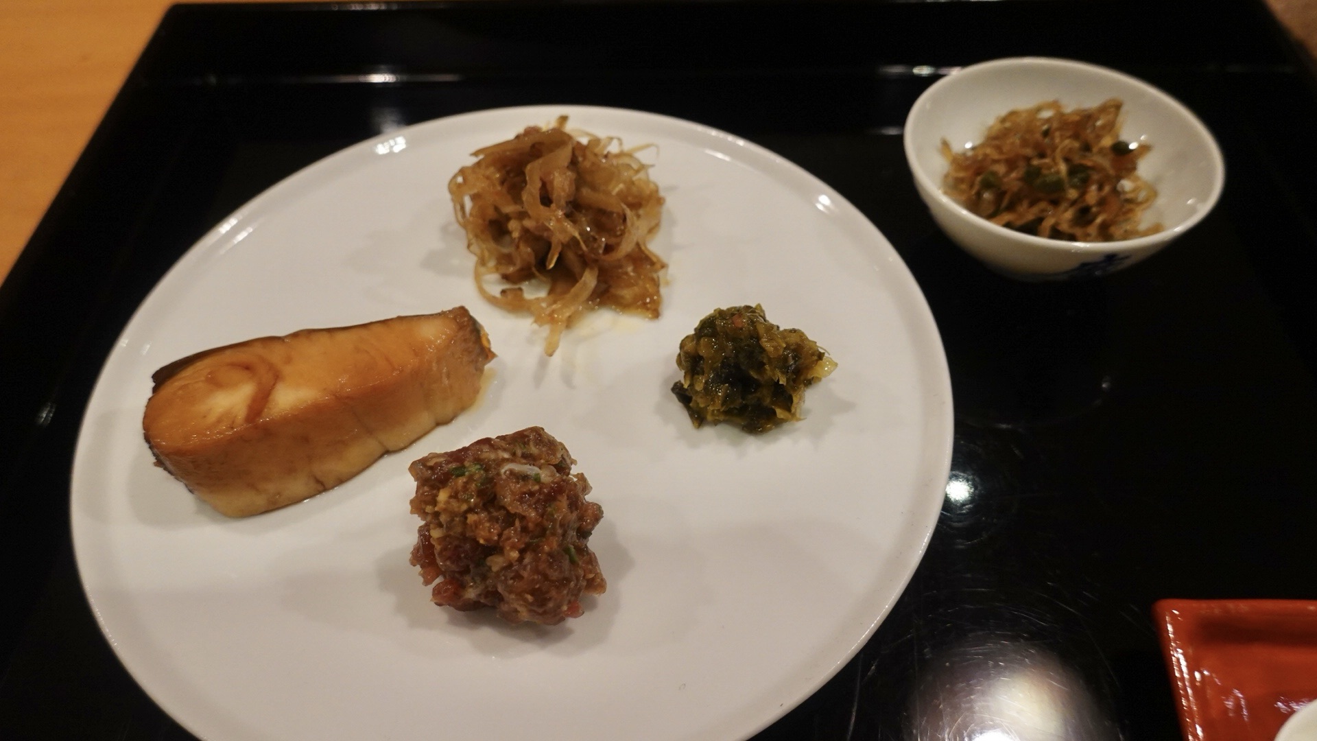 マグロ中落ちのなめろう、高菜の梅肉和え、豚とごぼうのきんぴら、鰆の煮物、雑魚とちりめん山椒。