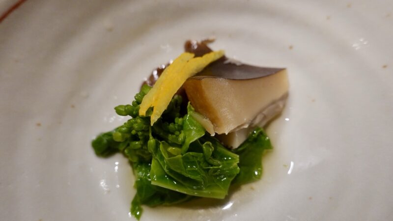 白魚、仙台セリ、沢庵、海苔のサラダ。食感と香りがいいサラダ。