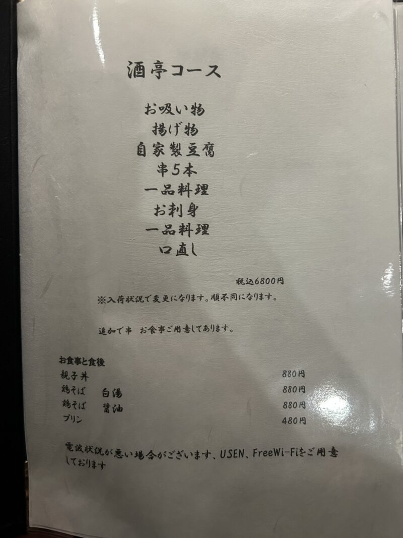 コース内容には、串焼き5本、刺身、お吸い物、揚げ物、一品料理などが含まれ、食後には単品の串や食事の追加も可能。