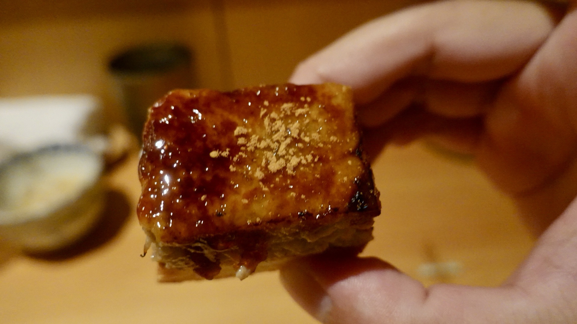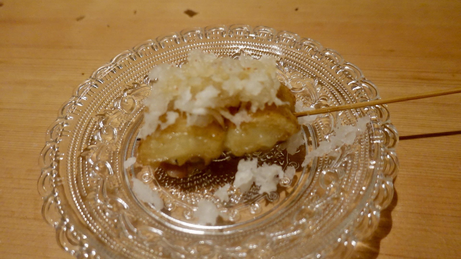 スネの間にネギを挟み、皮をまいて、日本酒の酒粕を塗っている。素敵な口内調理。