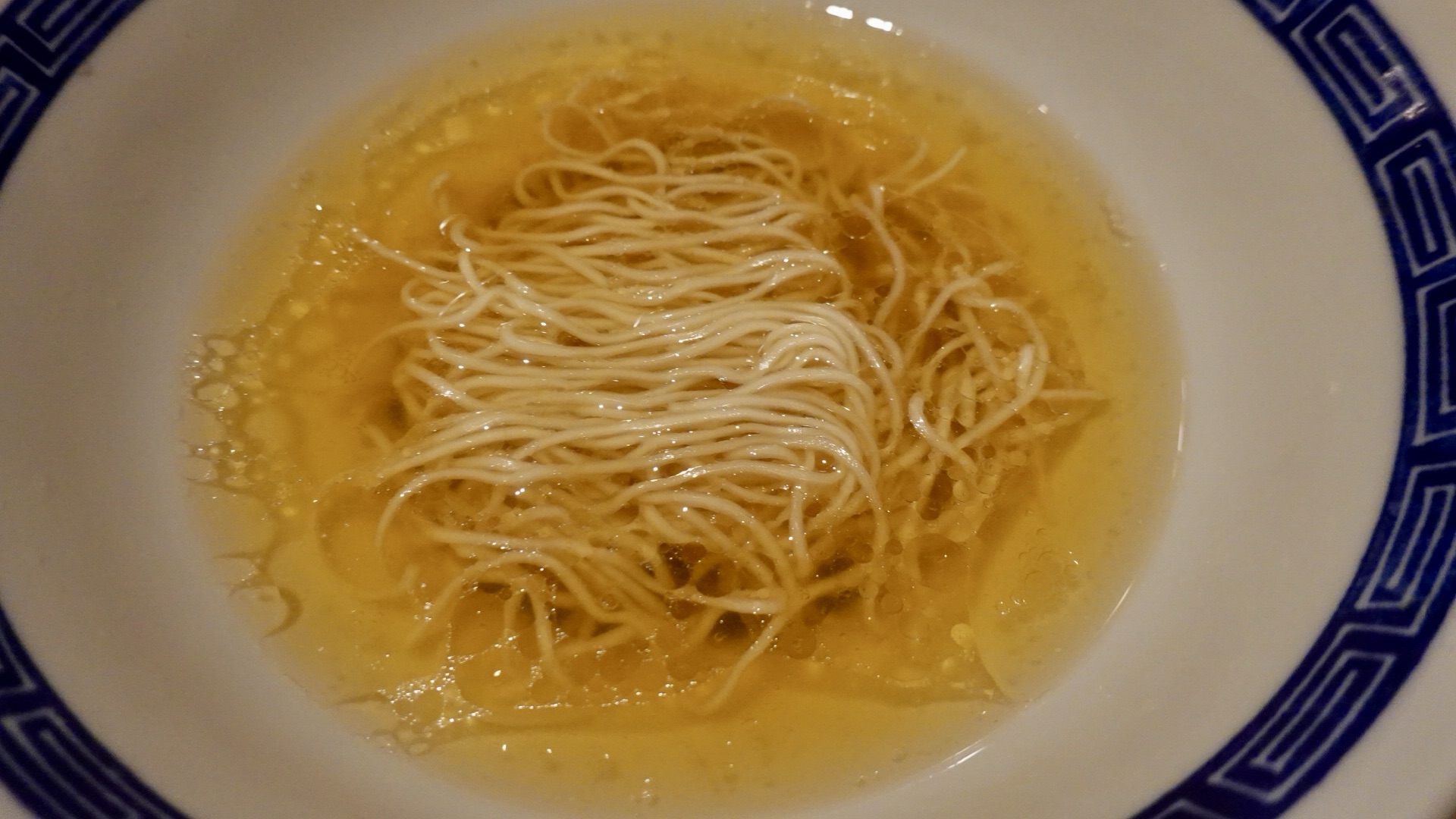地鶏だけでなく、野菜なども使ったコンソメスープ。具材はなく清湯スープが艶やかで美しい。