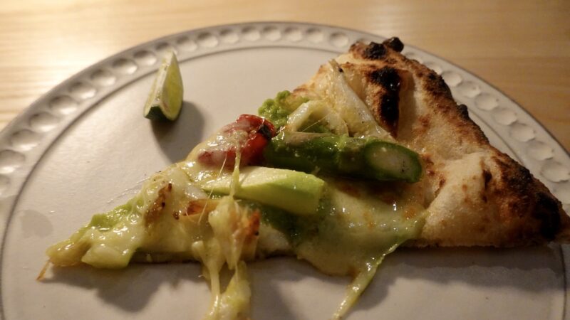 アスパラ、白海老、そしてチーズの香りが見事に調和。酸はドライトマトとスダチで。季節を知らせる5月のピッツァ。