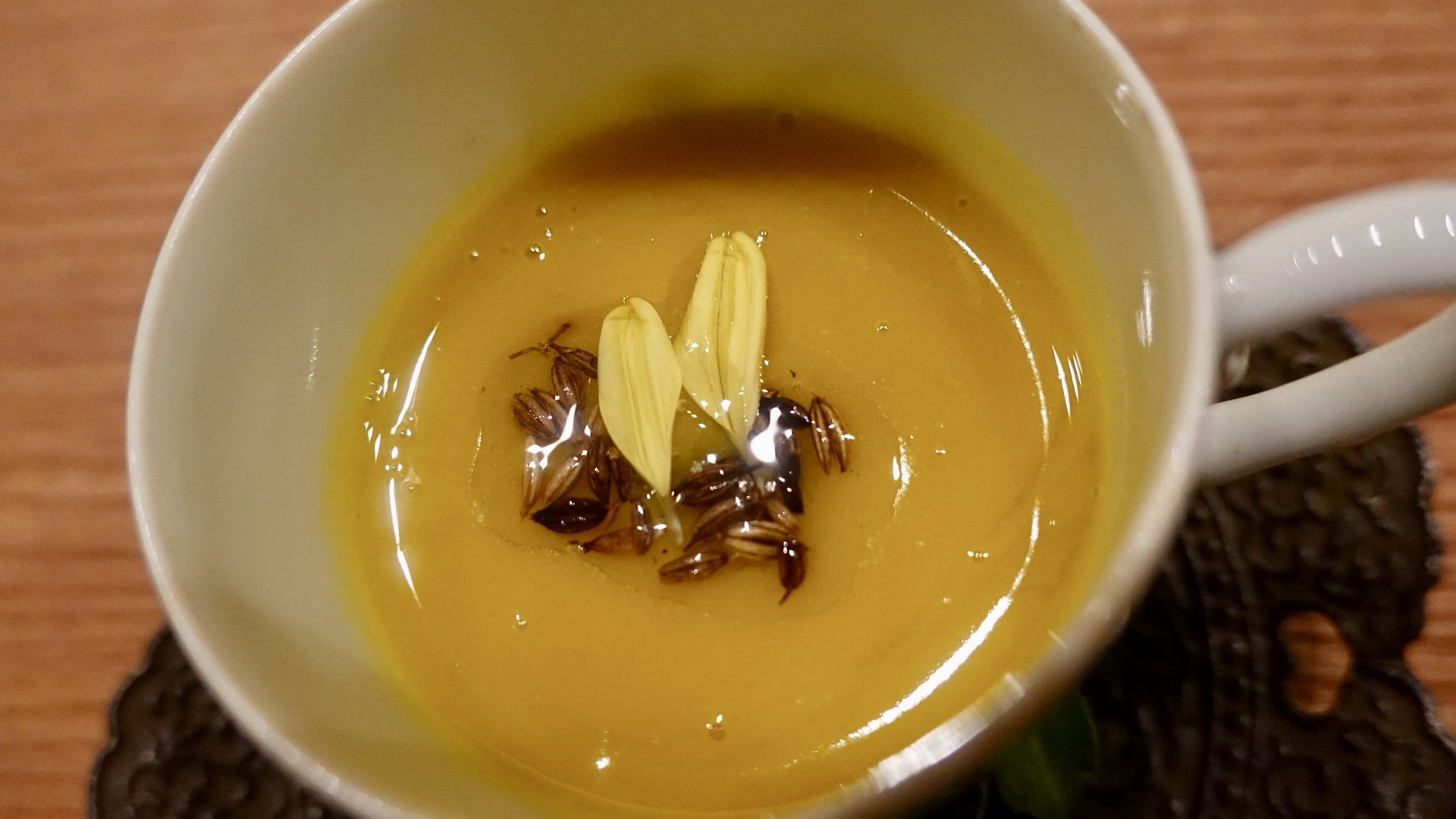 南瓜の優しい甘味にアジアンな香りのクミンオイルが印象的。