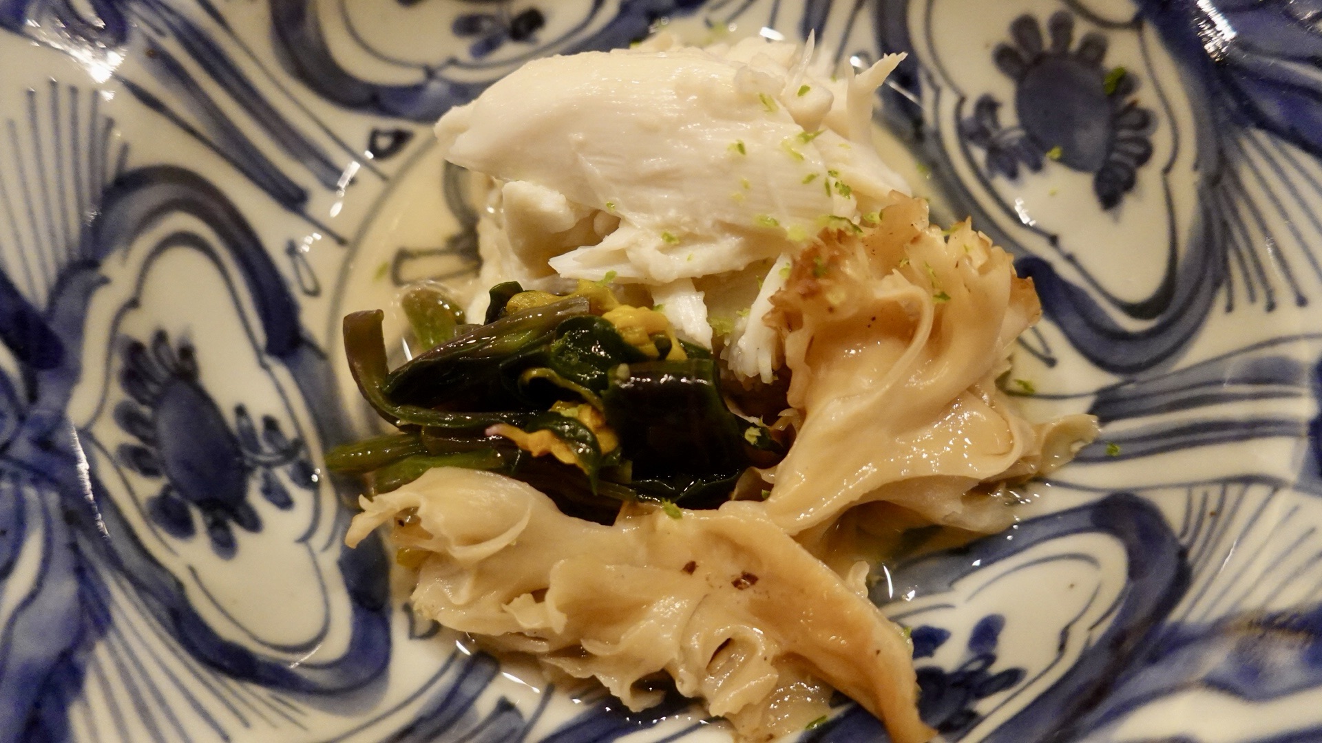 岩手のワタリガニ、金時草、花びら茸、地カラシ、江刺のレモンの皮と果汁。