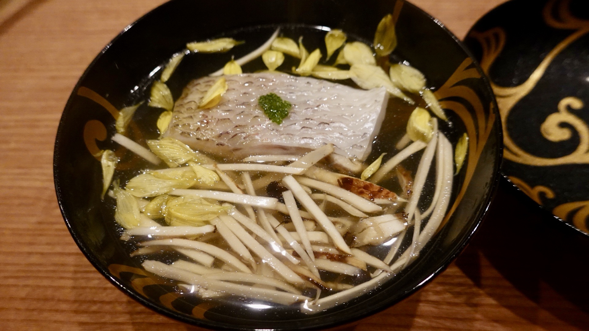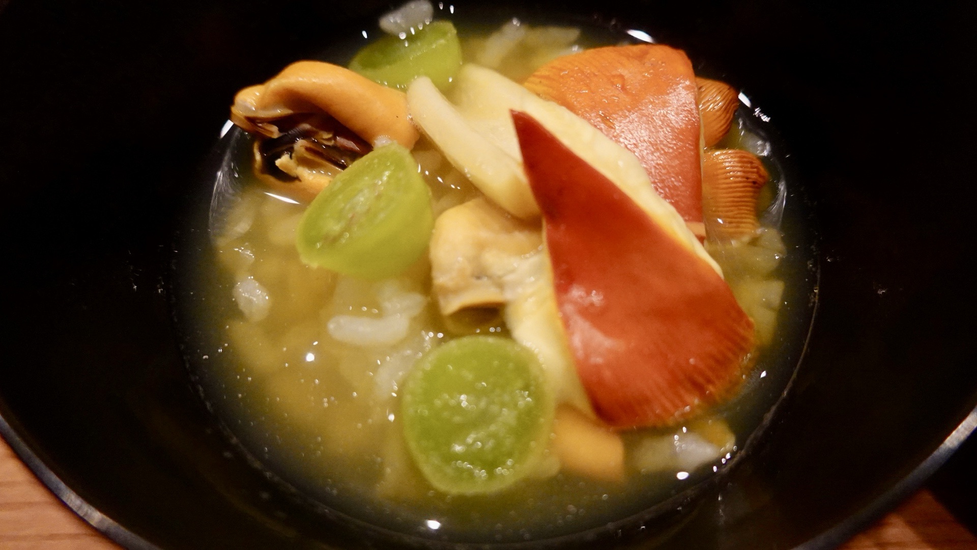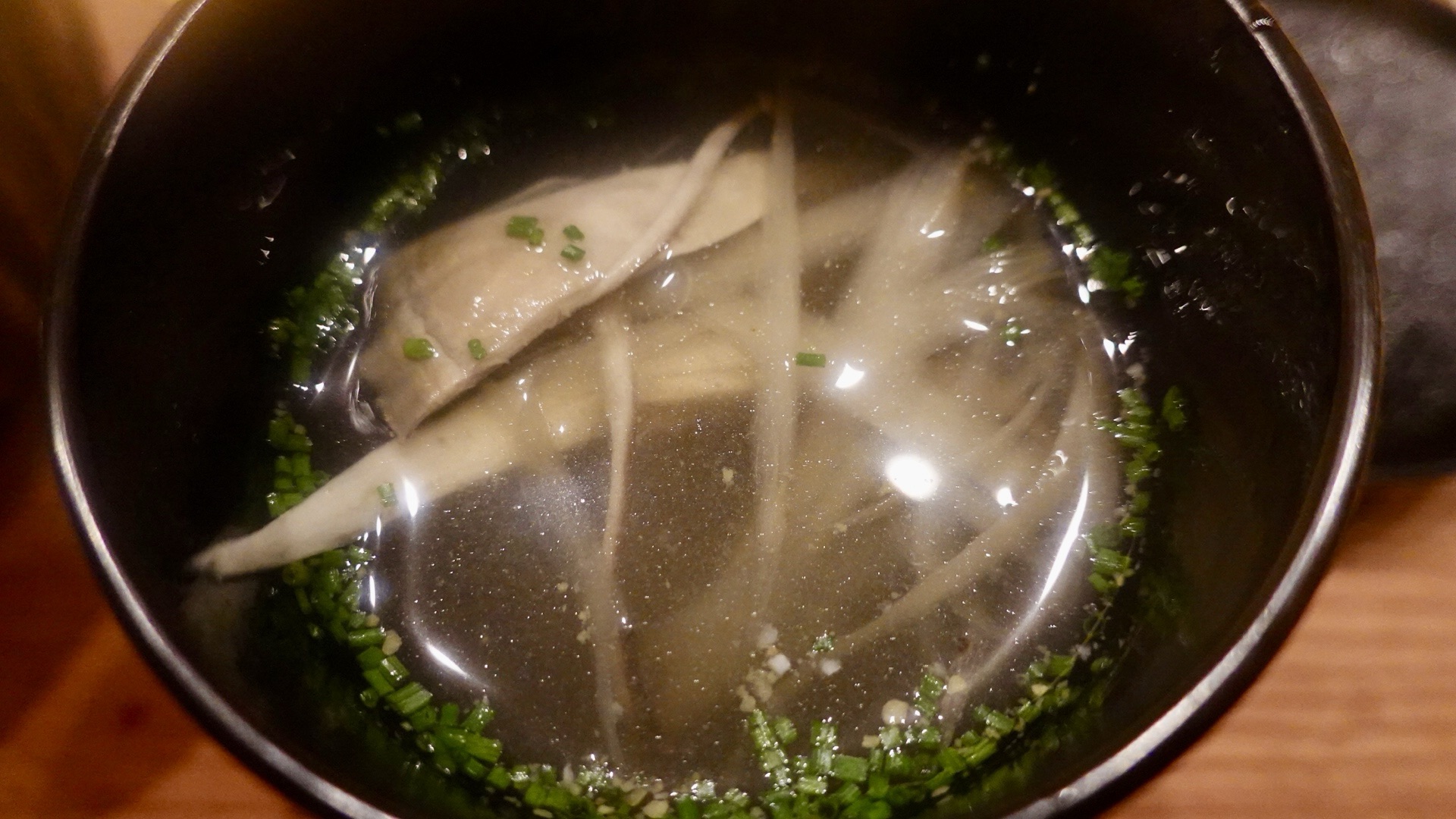 この出汁がめちゃめちゃ綺麗で身体が整うような感覚です。松茸は細くカットし香りと食感を演出。下には玉葱と具沢山なお椀。