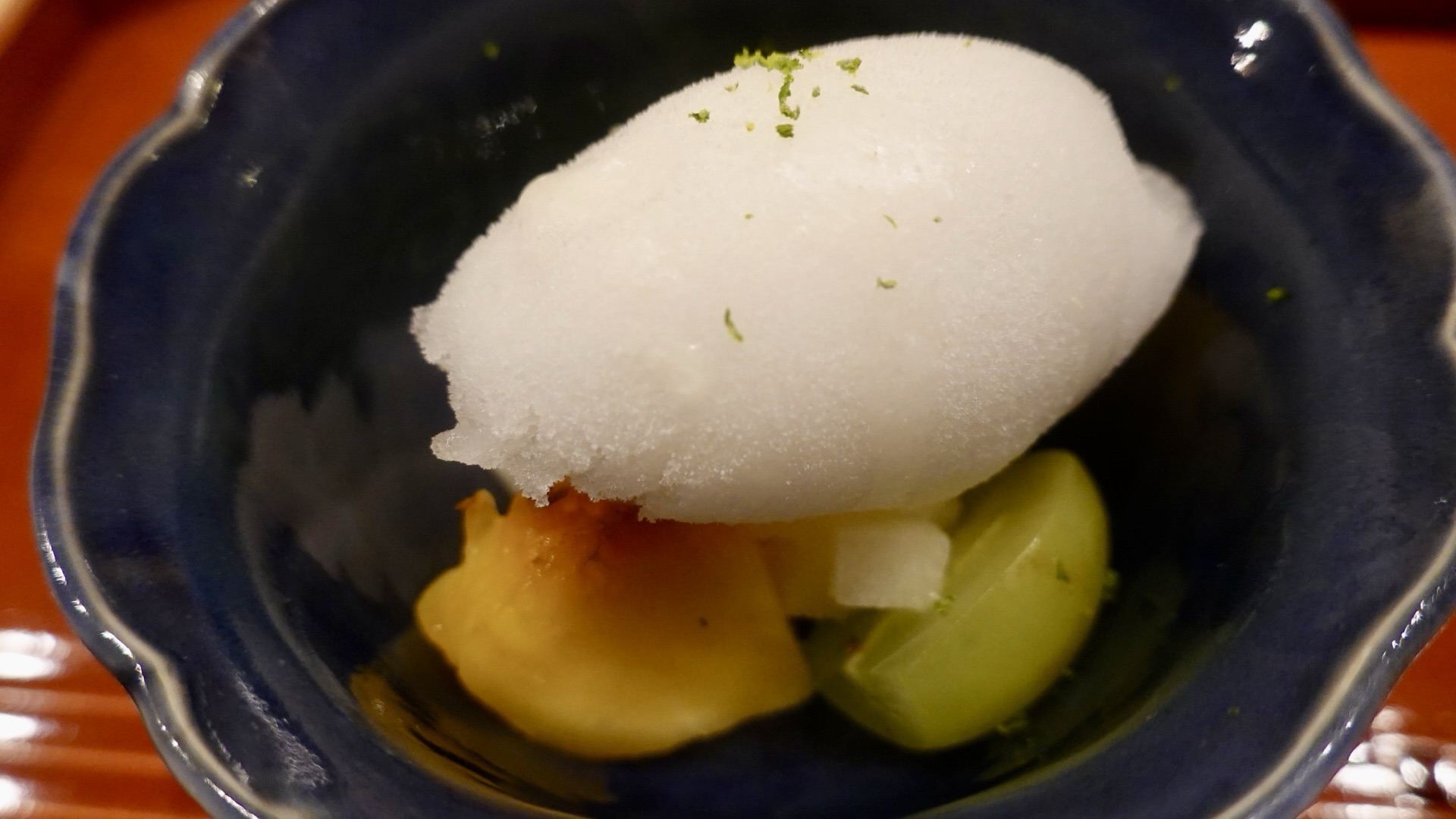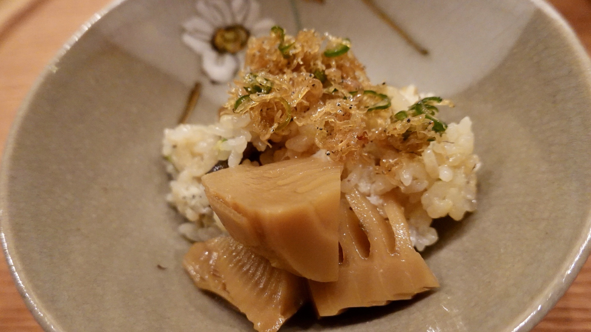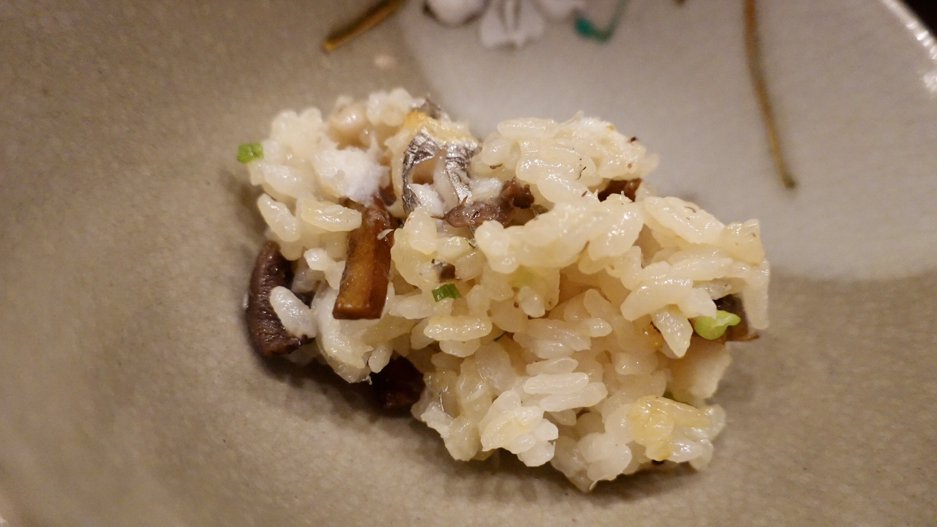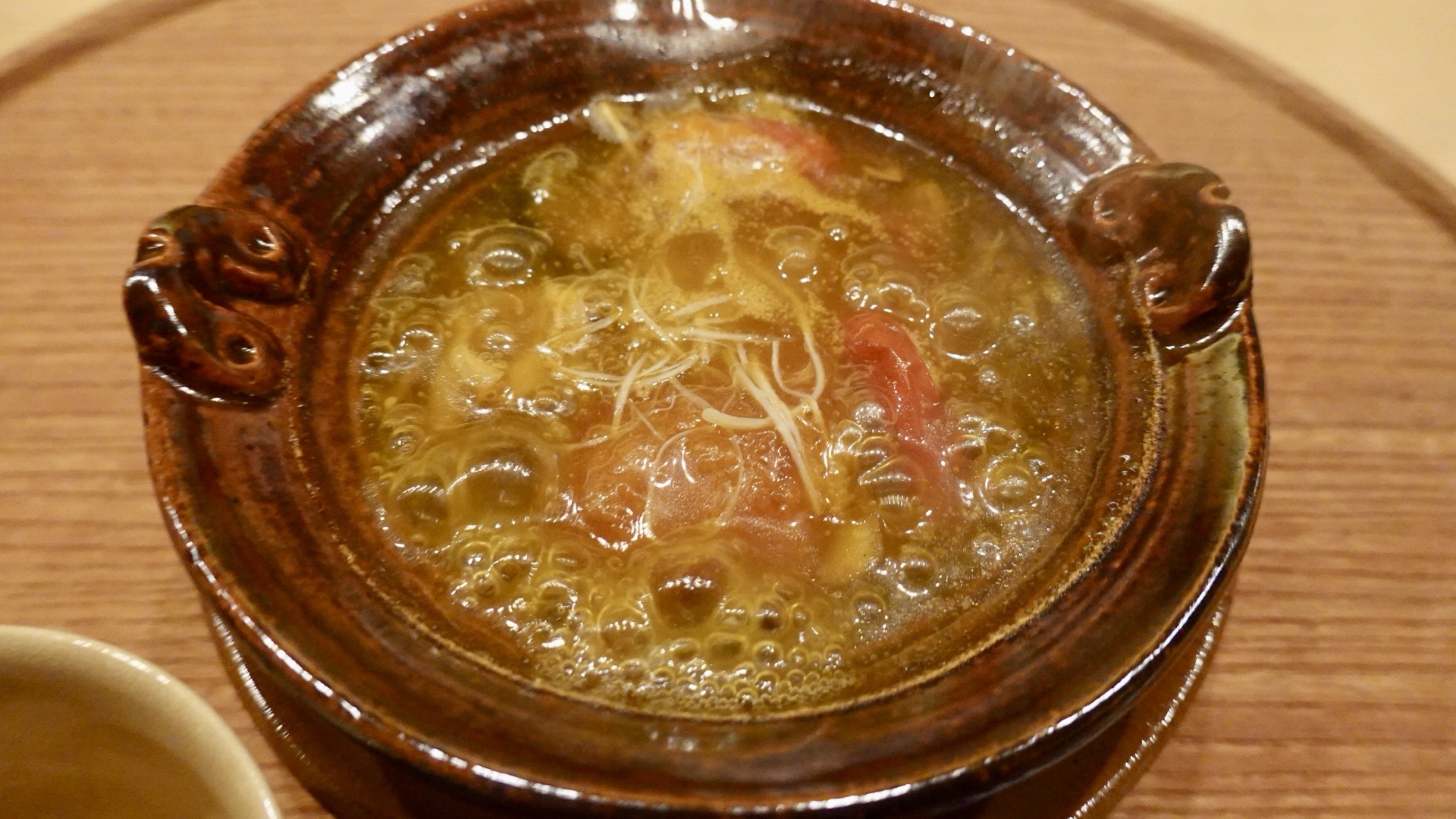 この出汁がめちゃめちゃ綺麗で身体が整うような感覚です。松茸は細くカットし香りと食感を演出。下には玉葱と具沢山なお椀。