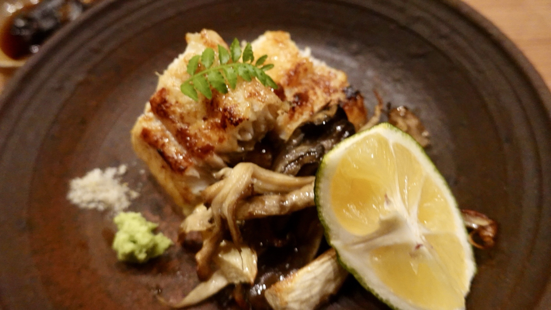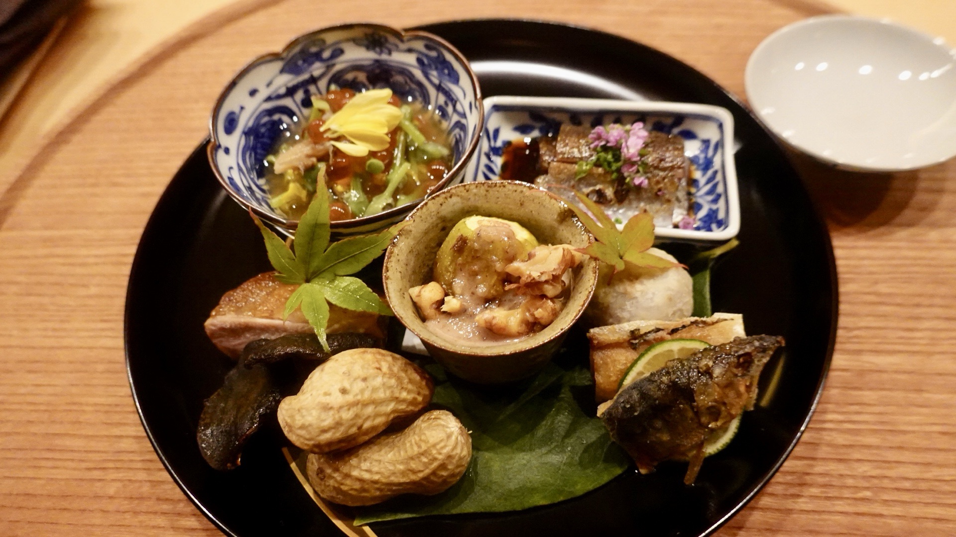 みずのこぶと天然の舞茸のお浸し、大船渡の秋刀魚、江刺の無花果炭火焼の胡桃酢がけ、花巻のホロホロ鳥、畑しめじ、落花生、二子芋の唐揚げ、気仙川の天然の鮎の唐揚げ。