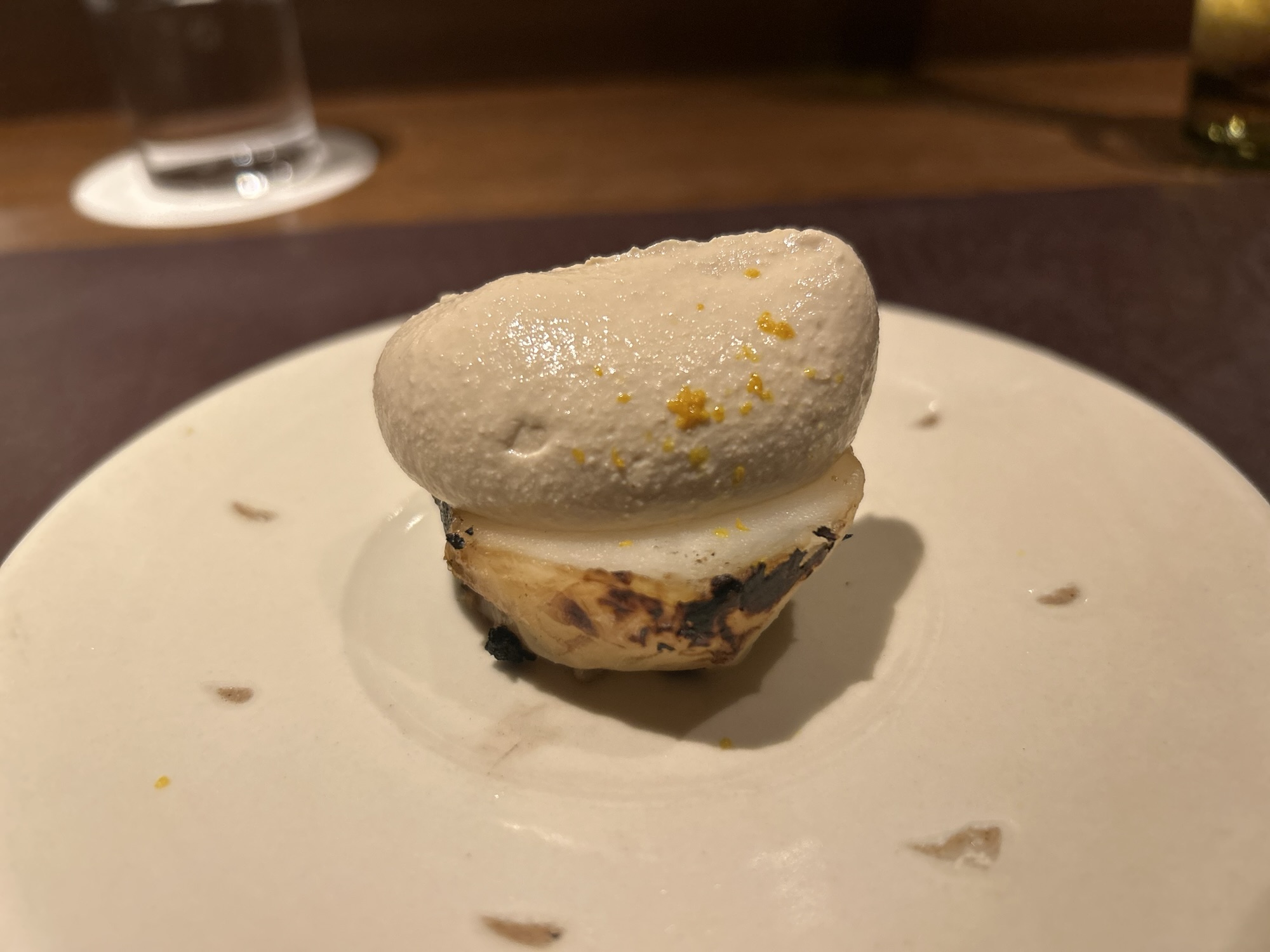 薪火で火入れした北寄貝は凄まじく甘く、生ハムをスープにして泡状にしたもの。オクラはこの甘味に寄り添い、バランスを取っている。