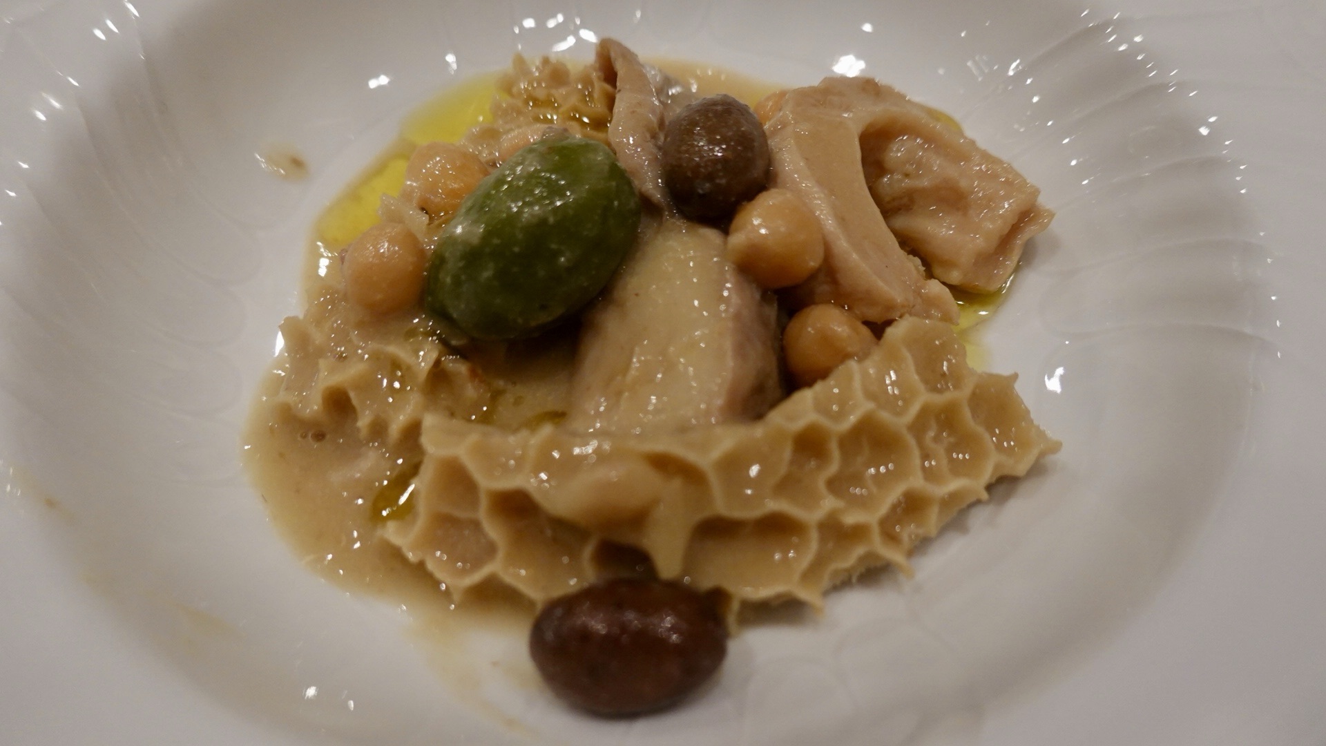 リグーリア風なのでオリーブの実が入っている。ハチノス、赤センマイ、盲腸。