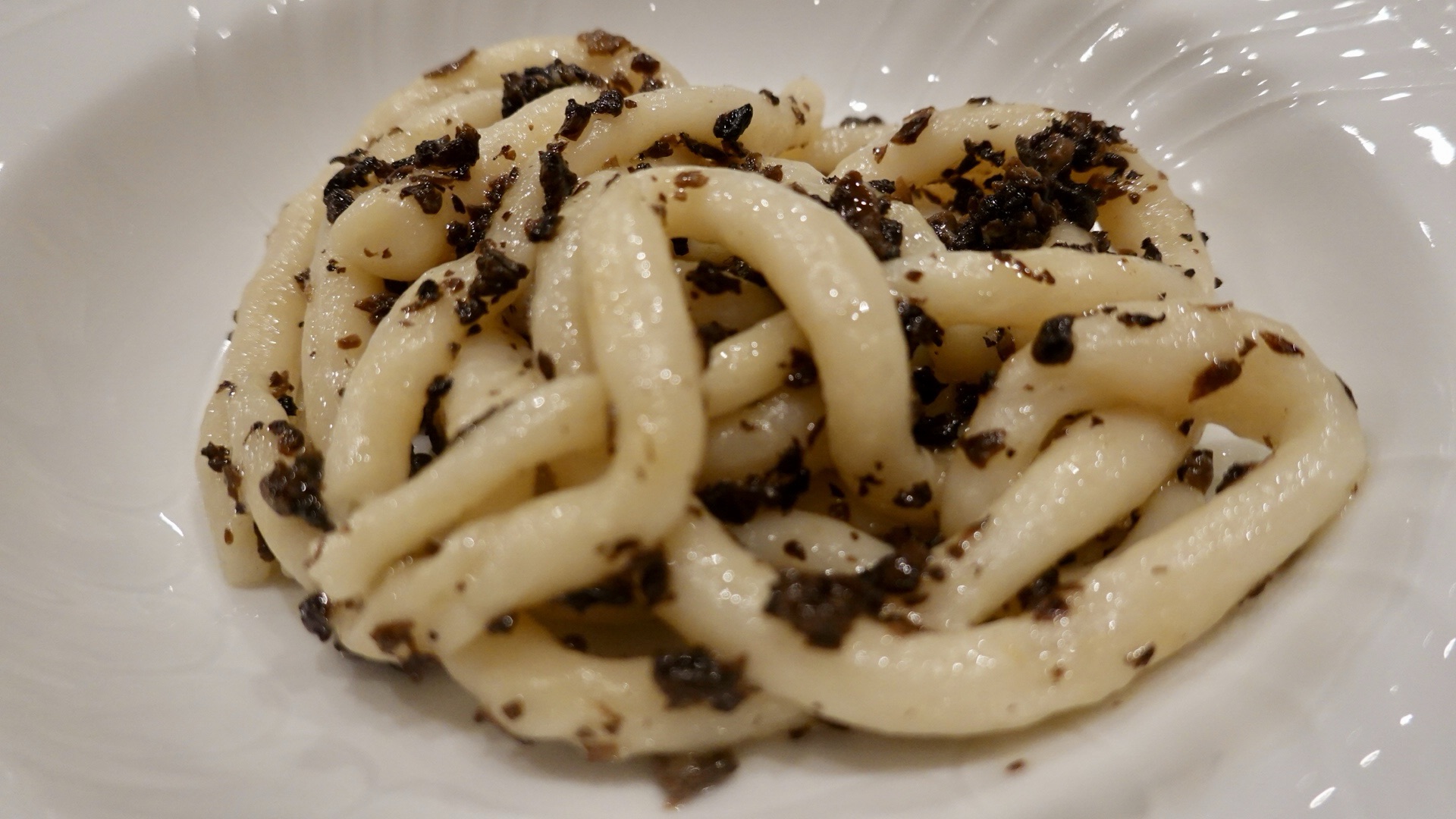 ウンブリア州の「ウンブリチェッリ」。これはピチと同じものでうどんのようなもっちりとした麺。濃厚なマッシュルームのラグーソースが絡む。この不思議な食感に酔いしれる。