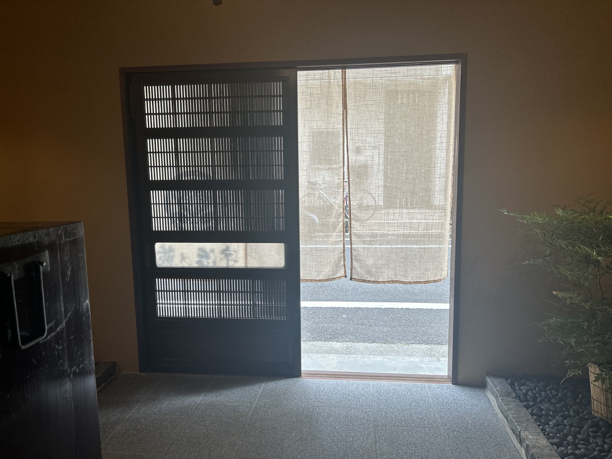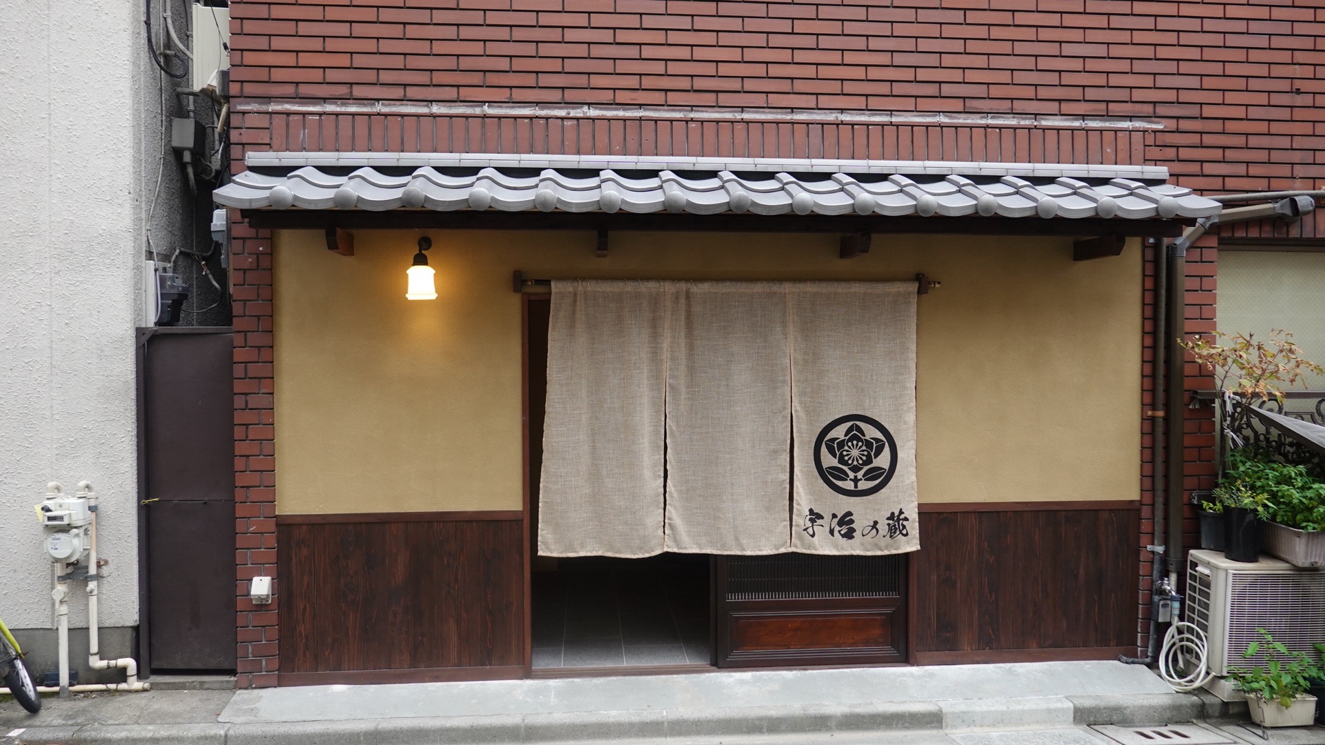 静かな通り沿い、控えめな木製の看板と小さな暖簾。