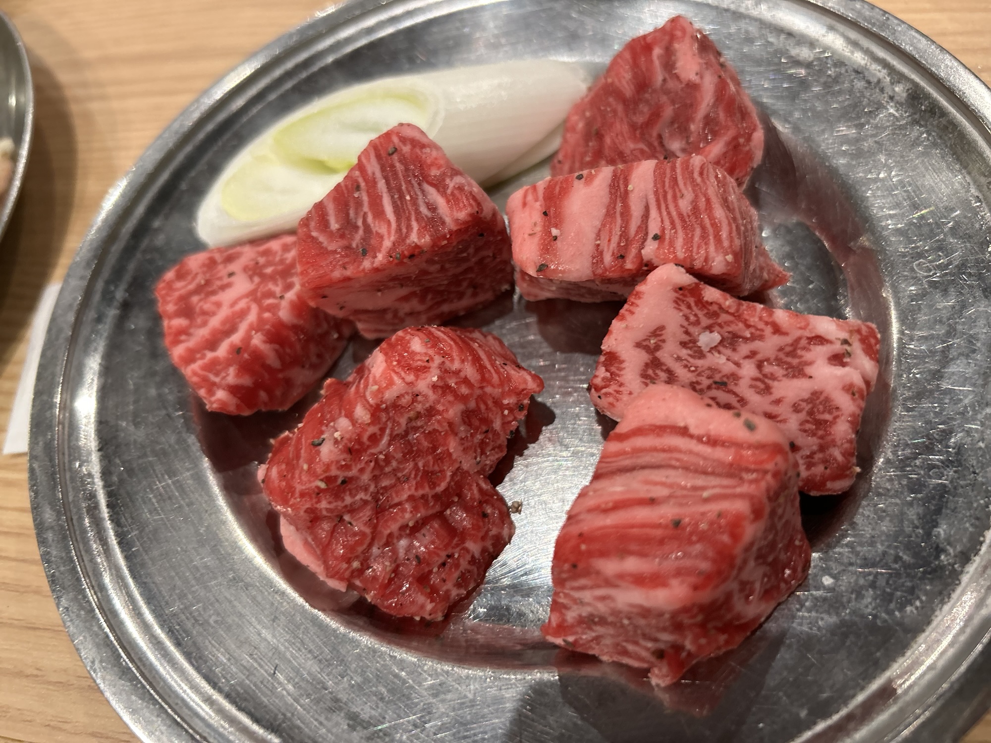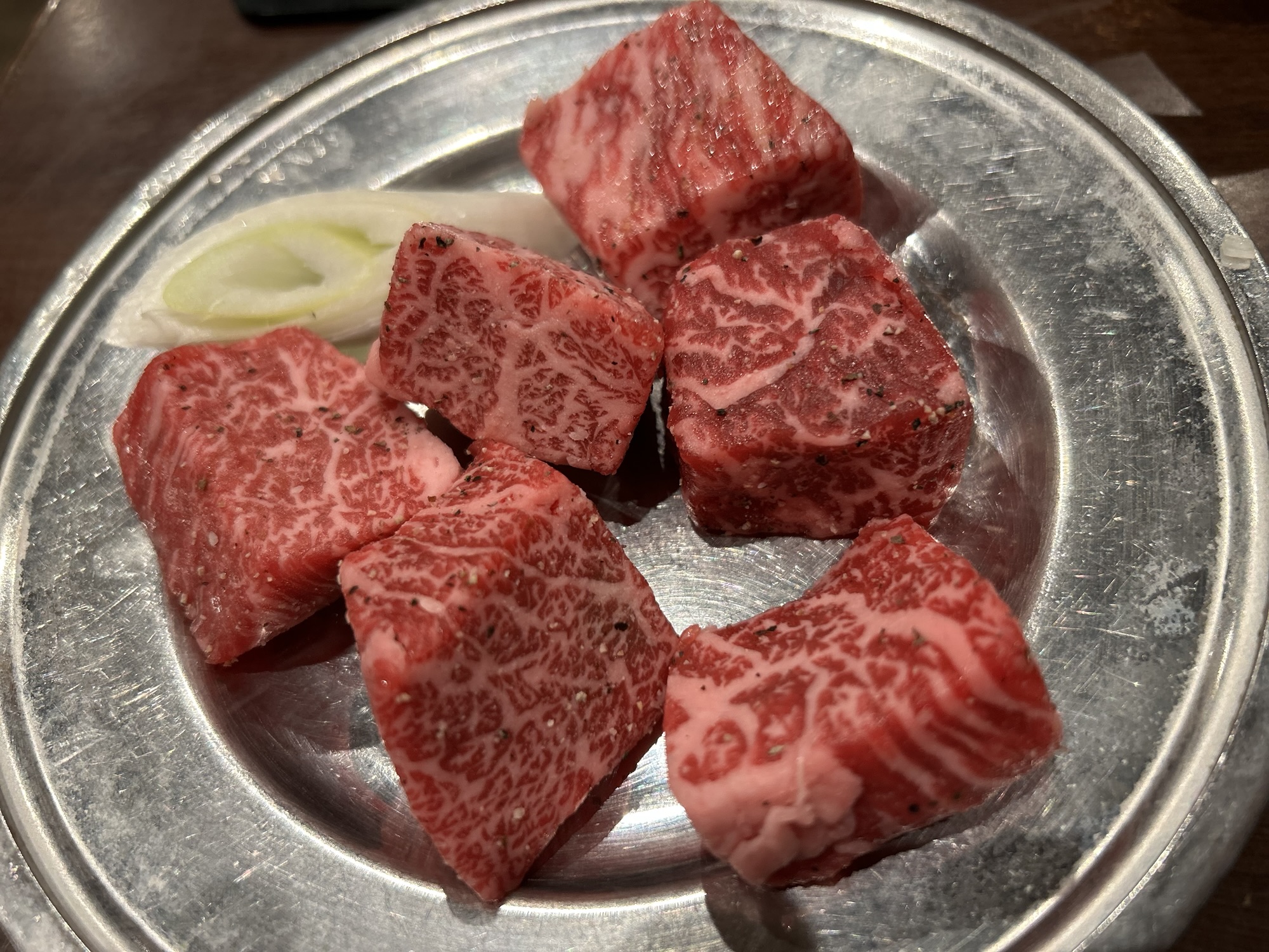 カイノミのカットは特徴的で分厚くサイコロのようなブロック状。上下だけ炭に近い部分で焼いて休ませれば肉汁が中に内包され、食べればジャワっと溢れ出る。香りも感じられる。