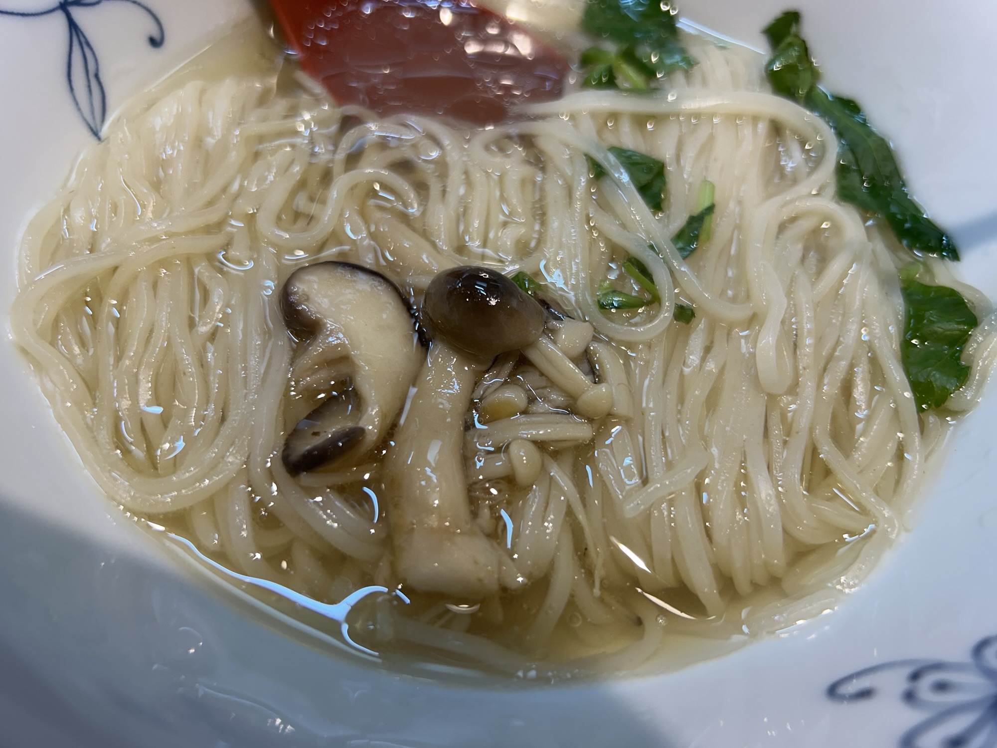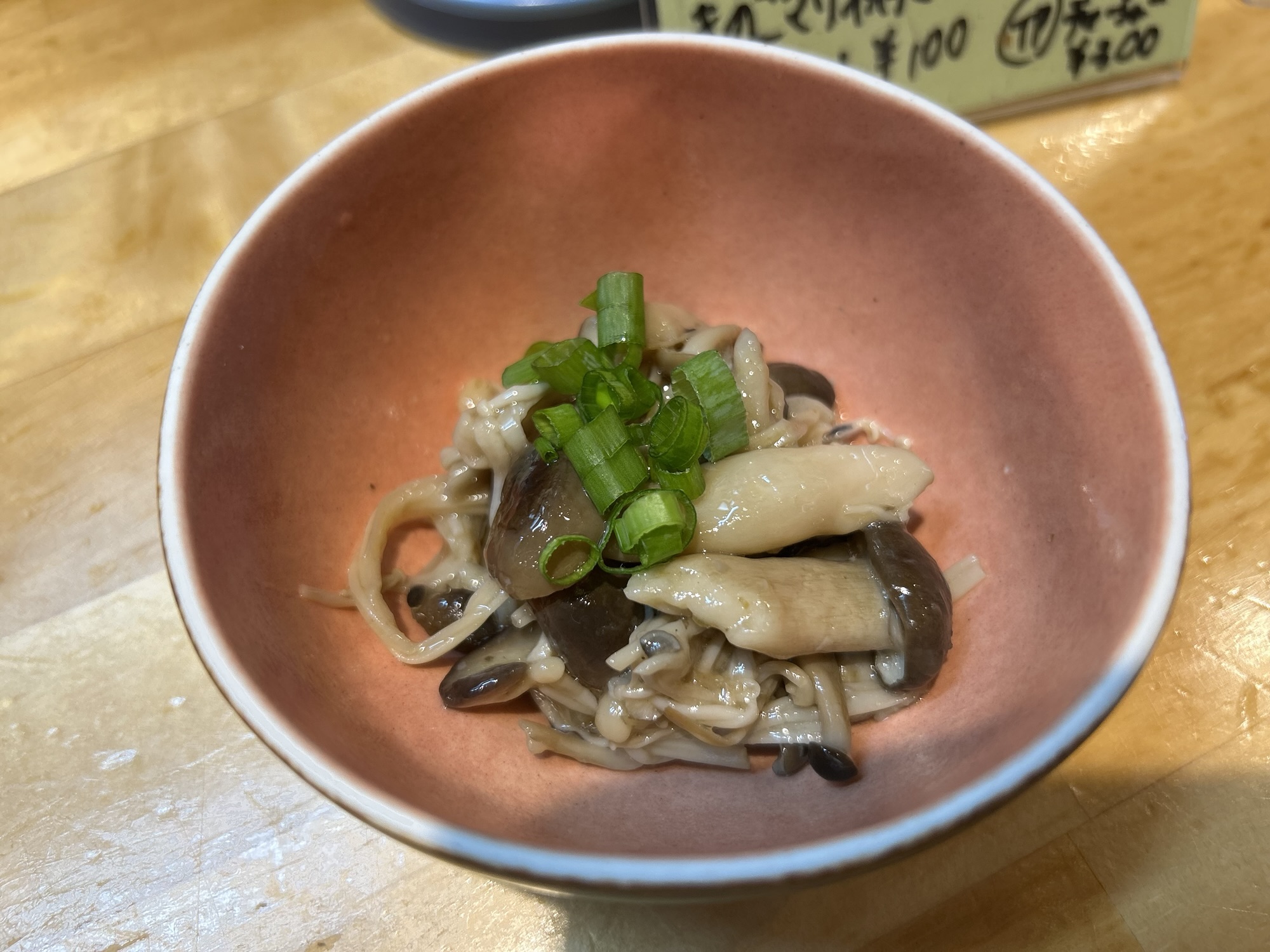 別皿のキノコのマリネを少しづつラーメン丼に入れていく。スープが徐々にキノコによる旨味が増していく。スープを最後まで飲んで気づいた。