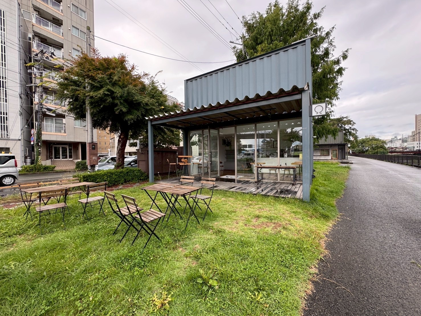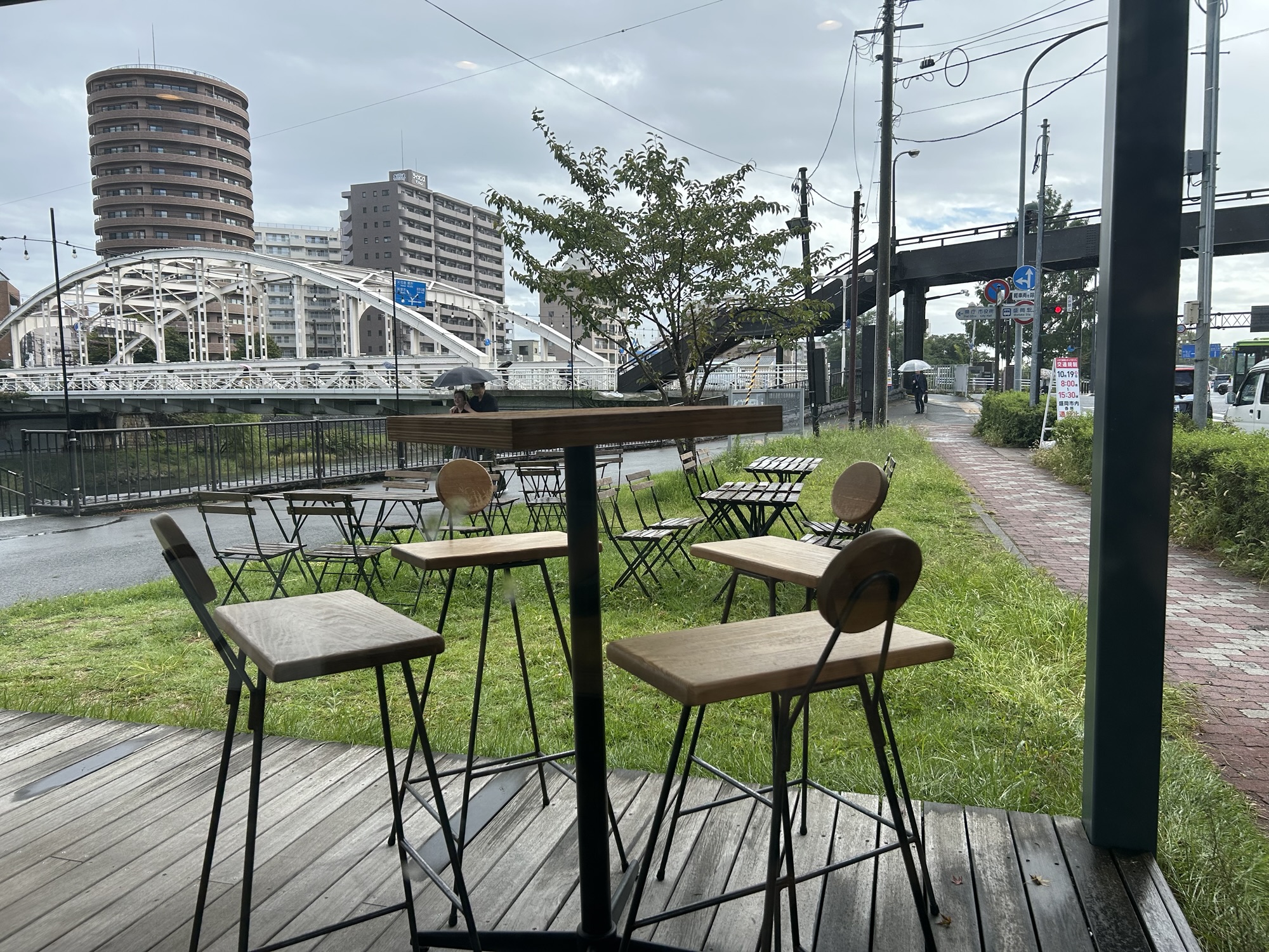 店舗の前にはウッドデッキと芝生のスペースが広がり、テーブルと椅子が並べられています。天気の良い日にはこの屋外席が人気で、北上川の川辺を眺めながらコーヒーを味わうことができるのは、まさに盛岡駅前とは思えない贅沢なロケーションです。川に架かる橋や周辺の高層マンション群が一望でき、都市的な景観と自然が融合するユニークな景色を楽しめます。
