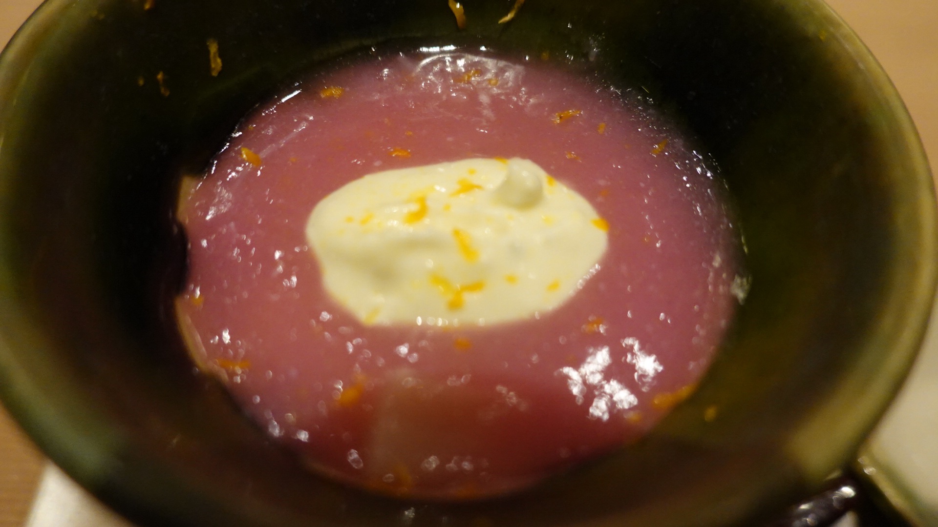 寒鰤のテリヤキ。赤蕪、ビーツ、バルサミコ、ポートワインのソースにピスタチオ。もはやフレンチです。
