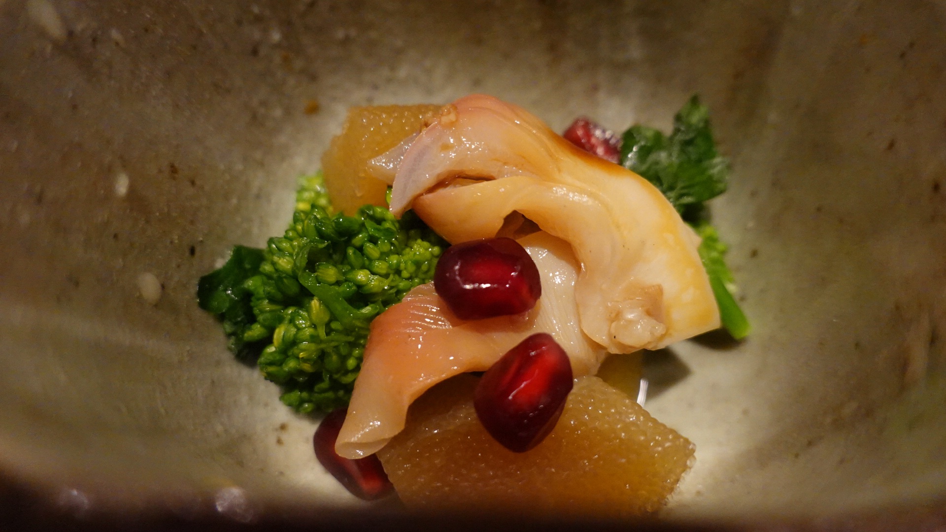 マイルドな中にジュンサイや甘酢に漬けた山葵の茎の食感や味わいがいいです。柚子の香りも爽やかでバランスが取れてます。
