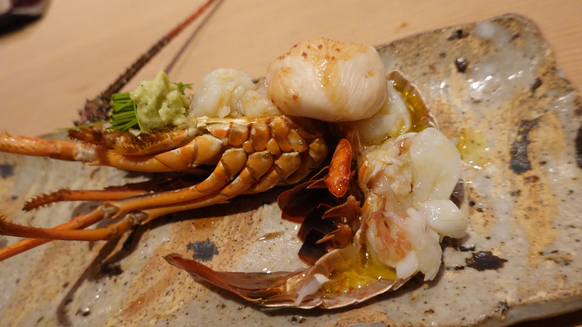 十四代で軽く酒蒸しにした伊勢海老、フグの白子。