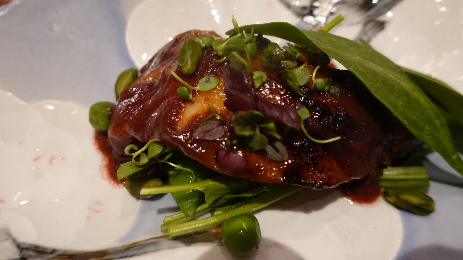 薫香のついた鴨肉に五香粉やピスタチオ、柚子胡椒の香りがバランスよく立体的に構築。