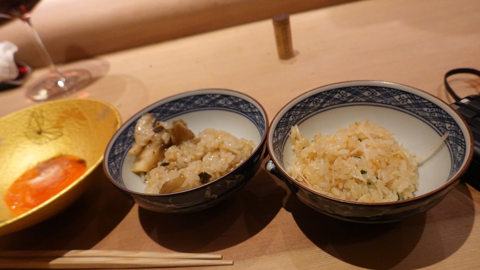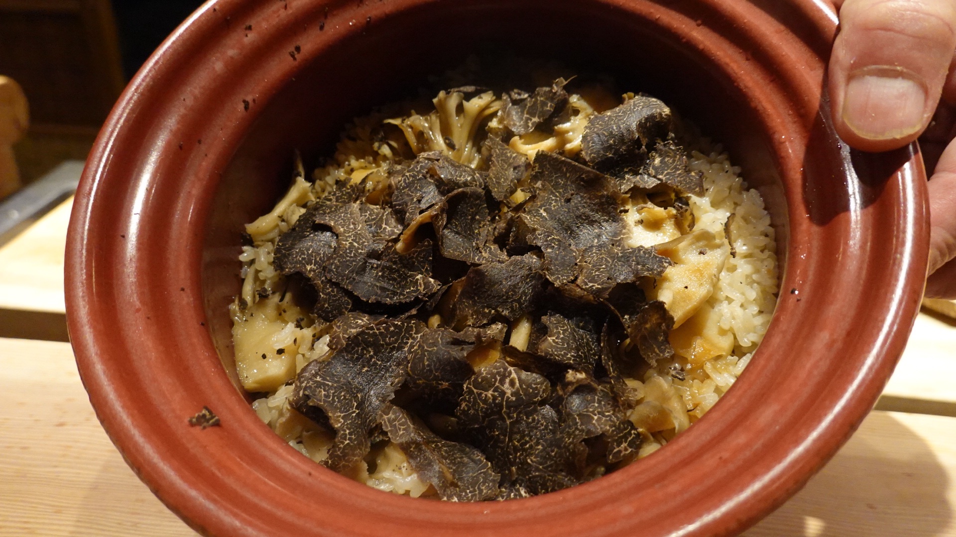 土鍋の炊き込みご飯は舞茸にトリュフご飯と越前蟹の炊き込みご飯。
