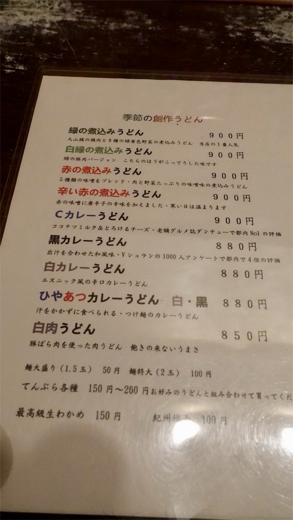 季節の創作うどんのメニュー。