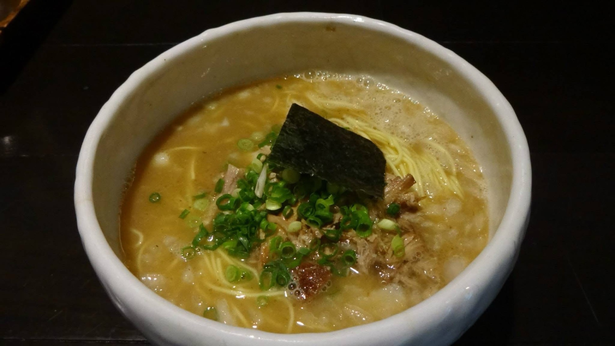具材はほぐしチャーシュー、ネギ、メンマ、ミニサイズの海苔。