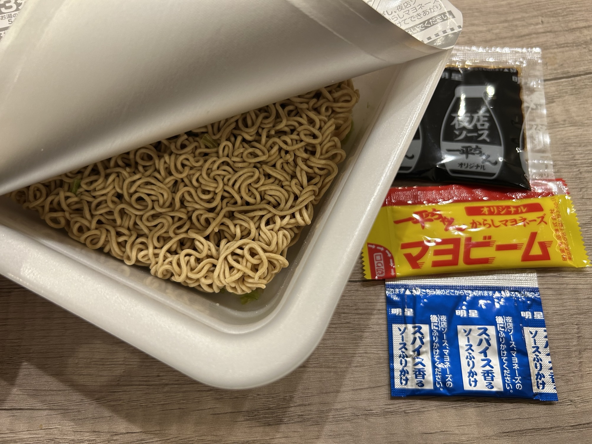 最大の特徴は麺130gのボリュームと、甘めでコクのある濃厚ソース、そしてキユーピーからしマヨネーズ付きというジャンク感全振り。