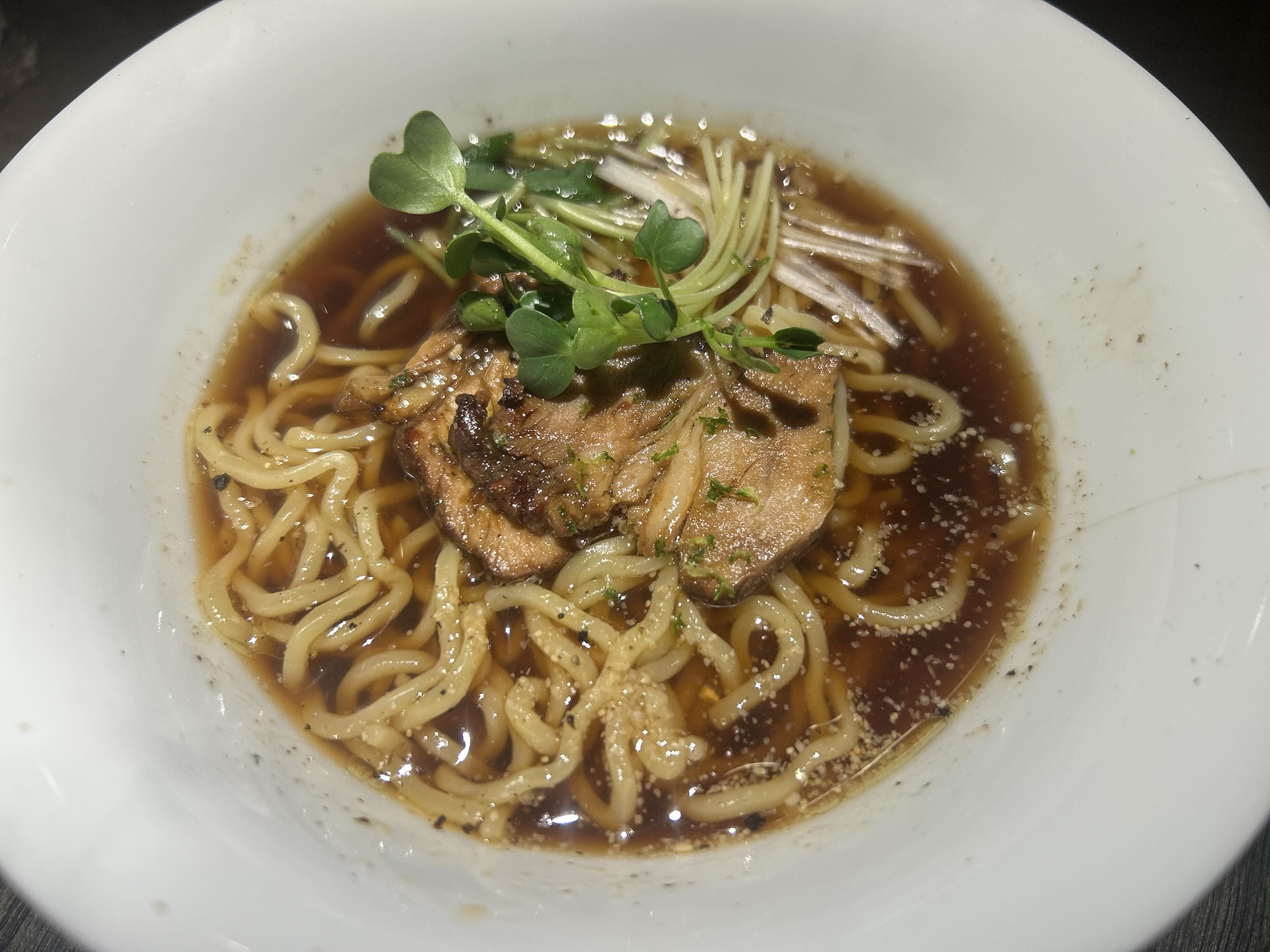 なんと豚肉のチャーシュー入り。カエシのキレを感じる鶏出汁にプリプリの中太縮れ麺が絡む。