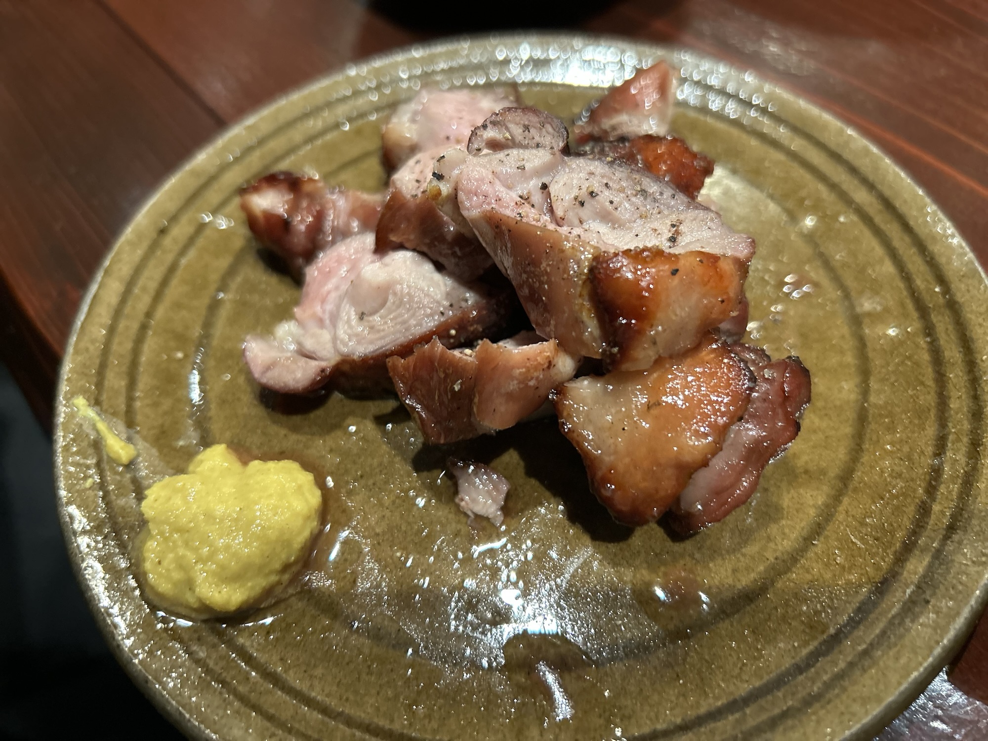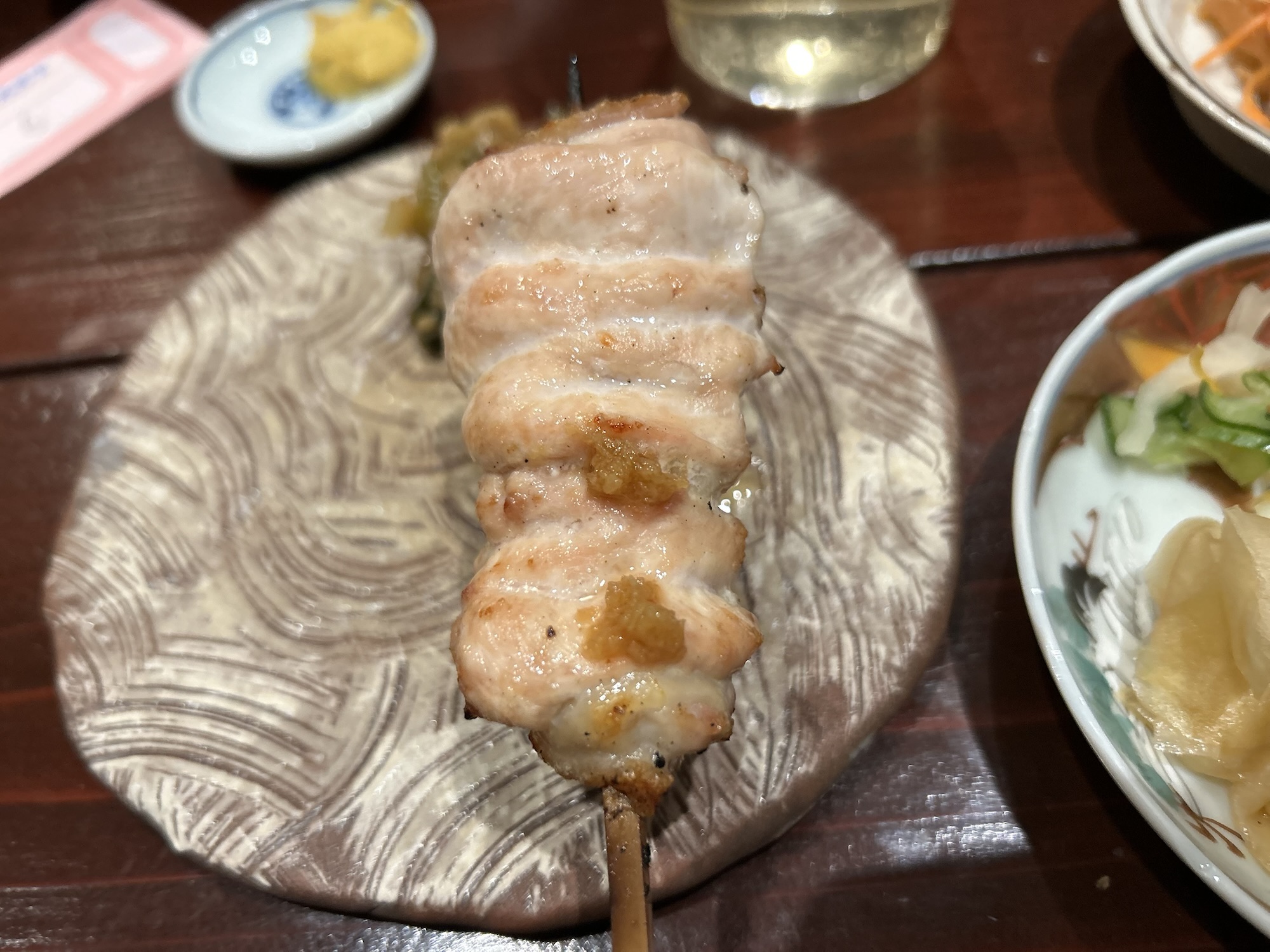 中はレアでしっとりと。山葵と生姜。ポーションは大き目で「いかにも焼き鳥食ってる感」。
